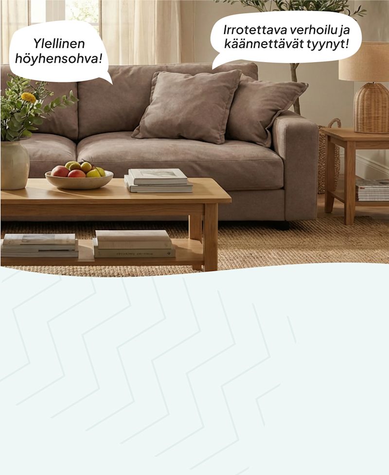 Tutustu huonekaluvalikoimaamme, ja anna kotisi uuden ilmeen suunnittelun alkaa! Meiltä löydät kaiken tarvittavan - mukavista sohvista ja rentouttavista nojatuoleista tyylikkäisiin ruokapöytiin ja mielenkiintoisiin sisustuselementteihin. Meidän avullamme luot toimivan ja houkuttelevan sisustuksen kotiisi. Inspiraatio odottaa – tee kotisi kauniimmaksi ja toimivammaksi juuri sinun tyylilläsi!